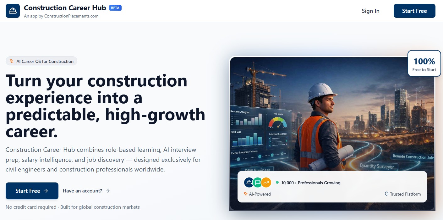 ConstructionCareerHub is an AI-powered career platform built exclusively for construction students, job seekers, and professionals. It helps you gain career clarity, improve job readiness, prepare for interviews, and make smarter career decisions—without guesswork.