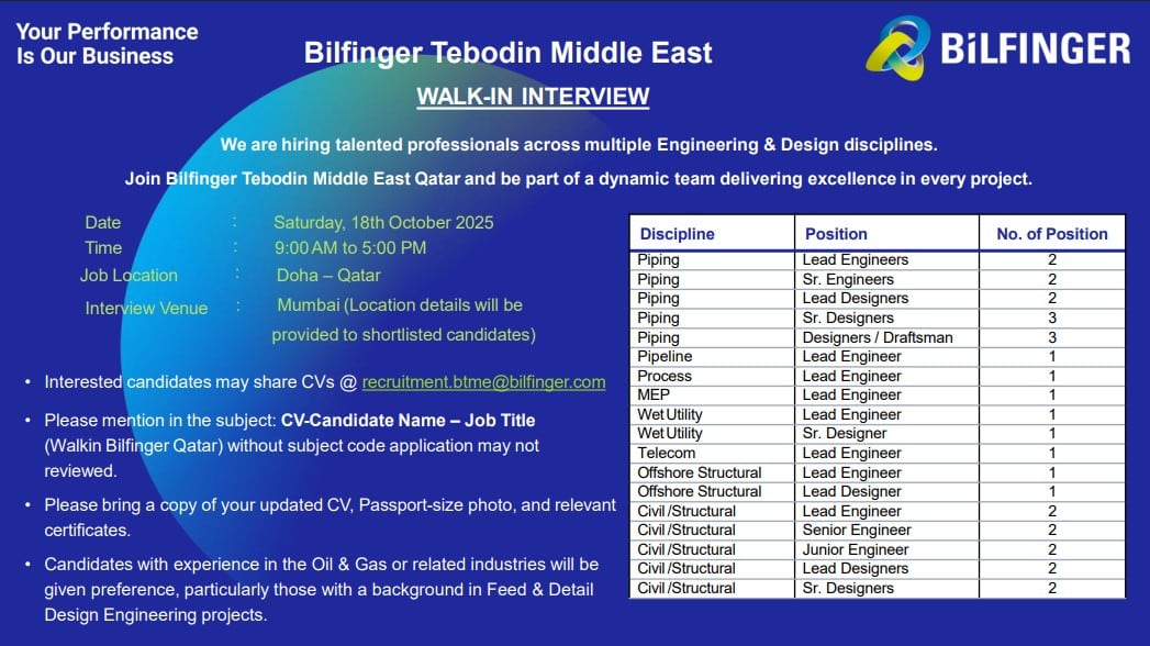 Bilfinger Tebodin Middle East Walk-in Interview on 18-10-2025 | Engineering and Design | Doha, Qatar