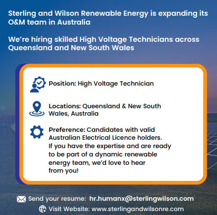 Sterling and Wilson Renewable Energy is expanding its O&M team in Australia and is hiring skilled High Voltage Technicians across Queensland and New South Wales. The uploaded poster states that the role is for High Voltage Technician, with openings across Queensland and New South Wales, Australia, and that candidates holding a valid Australian Electrical Licence will be preferred. The file also provides the application email and company website.