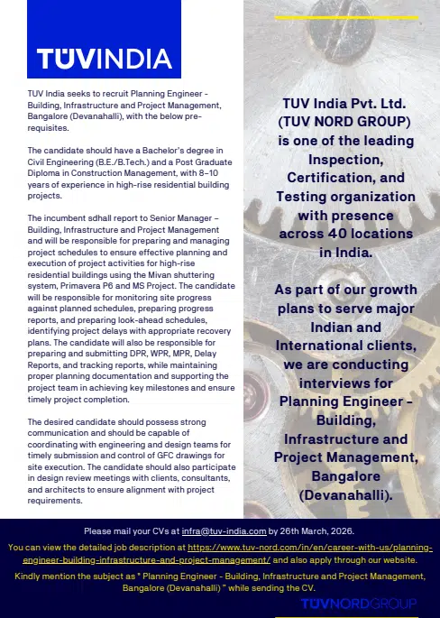 TUV India Pvt. Ltd. (TÜV NORD GROUP) is hiring a Planning Engineer – Building, Infrastructure and Project Management for its Bangalore – Devanahalli location. The role is part of the company’s Building, Infrastructure and Project Management division and reports to the Senior Manager of the same department.