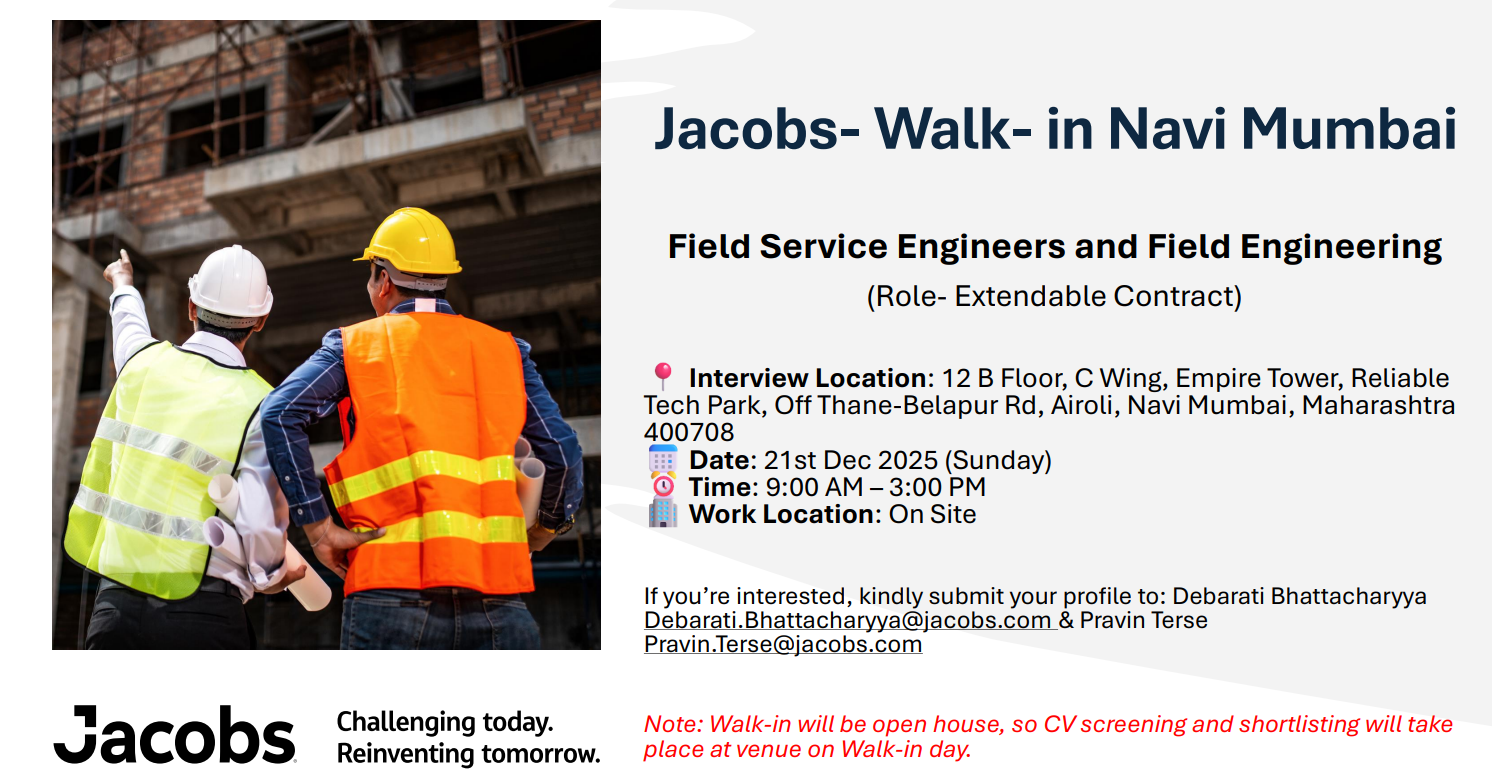 Jacobs is inviting experienced engineering professionals to attend an open walk-in interview for multiple Field Engineering and Field Service Engineering positions. If you have strong site execution, coordination, or supervision experience, this is a great opportunity to work on large-scale, complex projects.