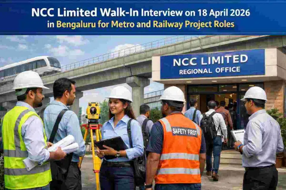 NCC Limited is conducting a walk-in interview in Bengaluru for multiple engineering and project support roles for its K Ride projects in Karnataka. The interview is scheduled for 18 April 2026 at 9:30 AM at the Regional Office, Bengaluru, located at 372/373, Sridevi Properties, Major Akshay Girish Kumar Road, Opp. Cambridge Public School, Yelahanka New Town, Bengaluru – 560064. The hiring drive covers roles in execution, contracts, QS/billing, QA/QC, resource mobilization, safety-HSE, and survey.