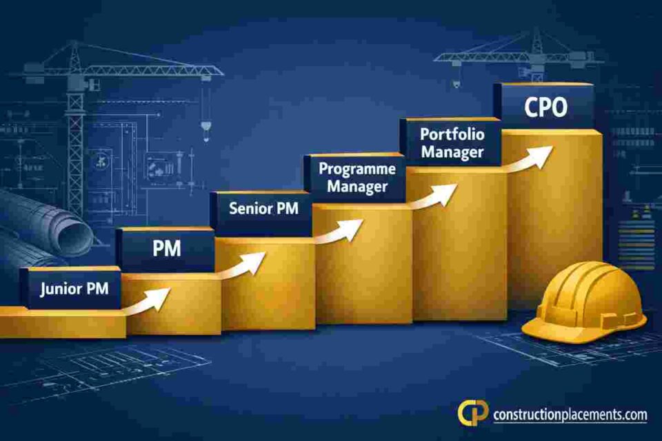 Graduate → Project Coordinator → PM (consultancy) → Senior PM → Programme Manager → Portfolio Director. Common via firms like Mace, Turner & Townsend, Gleeds, or AECOM. Broader sector exposure, faster title progression, but often less direct site experience.