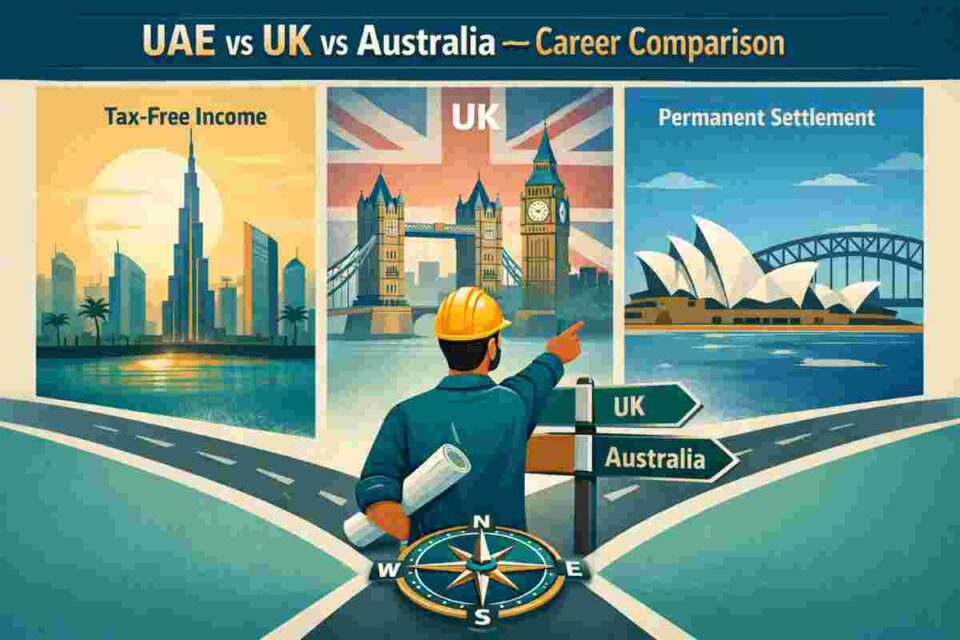 If you are an Indian engineer weighing your options between the UAE, UK, and Australia in 2026, you are not alone. These three destinations collectively attract over 60% of Indian engineering professionals who move abroad each year — and each country offers a radically different career equation. Tax-free earnings in Dubai, a structured pathway to permanent residency in Sydney, or a Chartered Engineer credential from London — the “right” choice depends entirely on your career stage, financial goals, family situation, and long-term settlement plans.